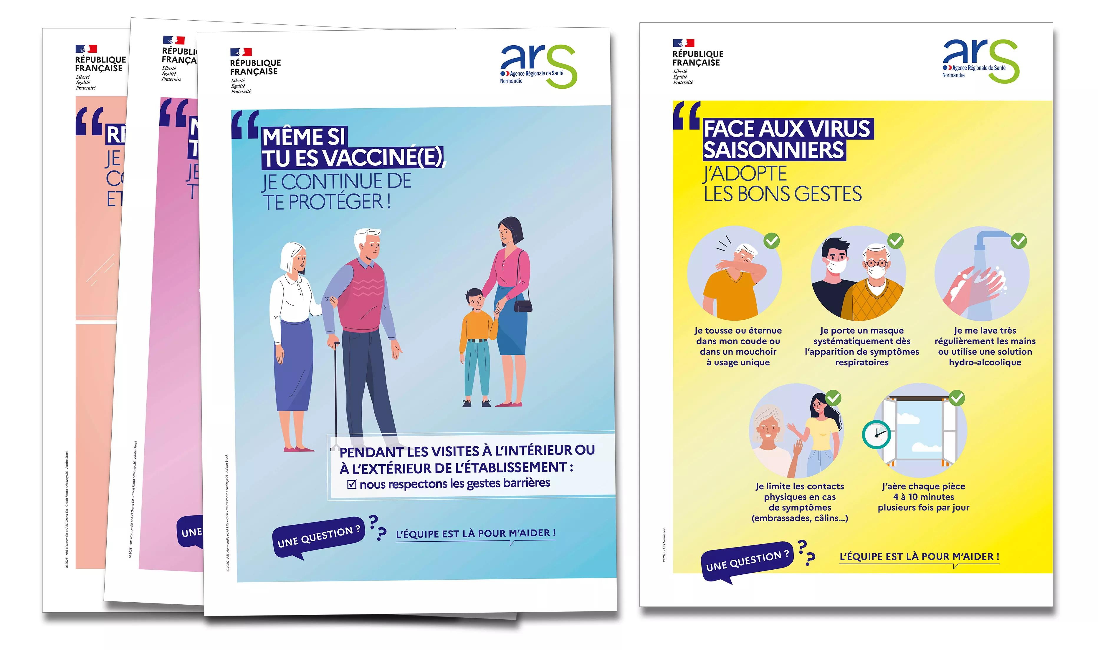 Pour accompagner les EHPAD dans la mise en place d'une campagne de sensibilisation pour la vaccination contre la grippe saisonnière et le Covid-19, et le respect des gestes barrières à destination des résidents d’EHPAD et de leurs proches, l’ARS Normandie met à leur disposition des outils de communication.