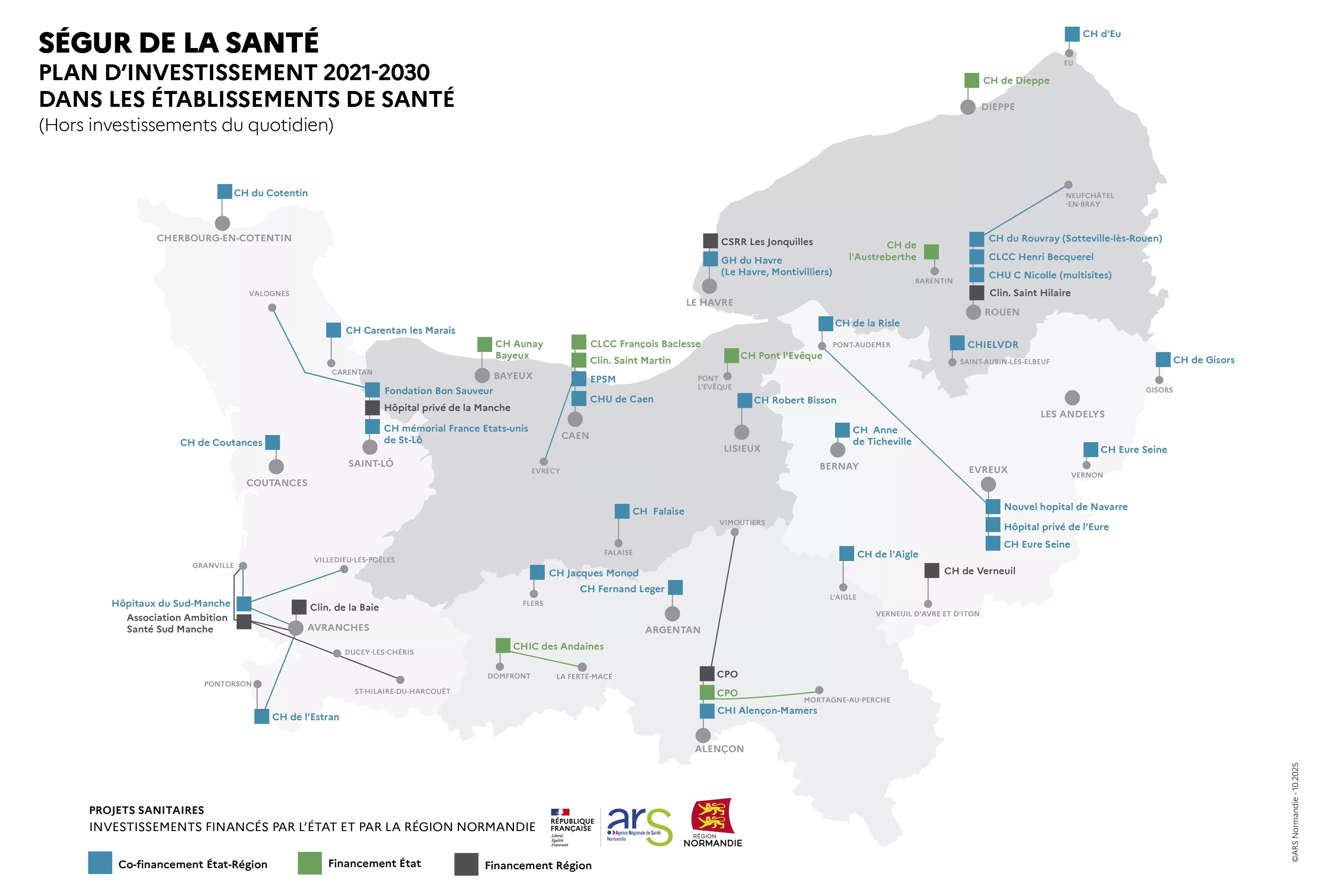 En Normandie, le Ségur de la santé s’est traduit par l’élaboration conjointe par la Région Normandie et l’Agence régionale de santé Normandie d’une stratégie régionale d’investissement en santé sur la période 2021-2030, à la suite d'un appel à manifestation d'intérêt lancé en mars 2021 et une concertation des acteurs de la santé et des collectivités territoriales, organisée en juin, juillet et septembre 2021.