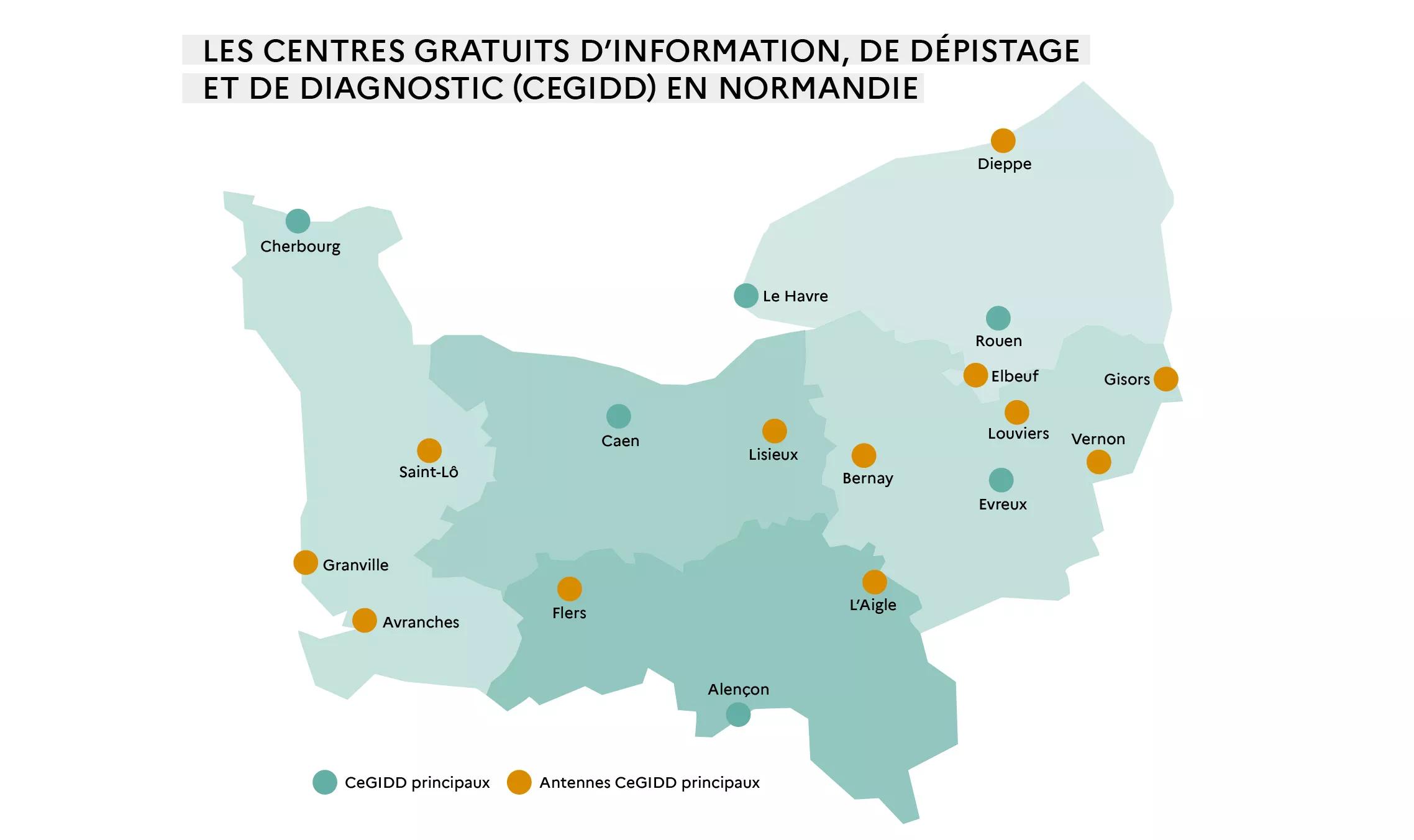 Dans les 6 CeGIDD (Centre gratuit d’information, de dépistage et de diagnostic du VIH, des hépatites virales et des autres infections sexuellement transmissibles) et 13 antennes en Normandie : gratuit et anonyme si vous le souhaitez, pour réaliser une prise de sang ou un Trod (test rapide d’orientation diagnostique).