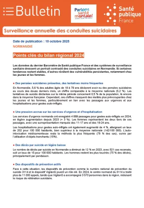 Santé publique France indique dans son bulletin « Surveillance annuelle des conduites suicidaires » en date du 10 octobre 2025, quelques chiffres clés concernant la Normandie :